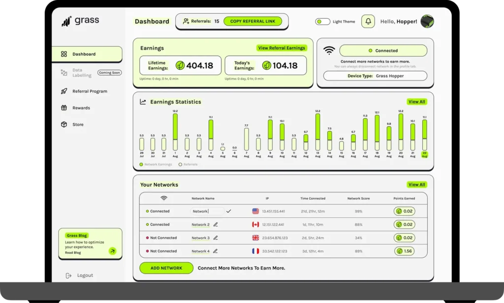 Grass is a network of millions of people who are earning rewards for sharing unused internet bandwidth with the Grass network.